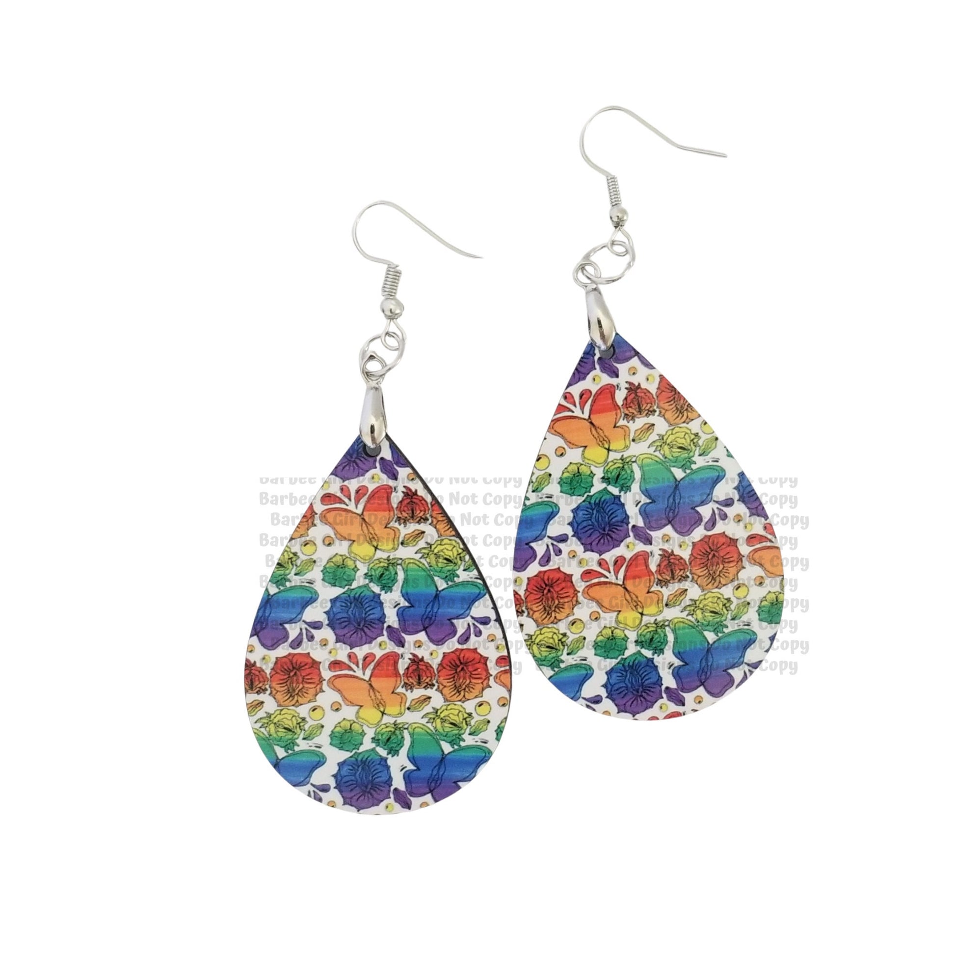 Who doesn't love fun earrings? These hardboard teardrop shaped earrings are super fun and a little naughty at the same time. What looks like a simple design is actually a design full of rainbow va jay jays and butterflies. The earrings are lightweight and fun to wear!